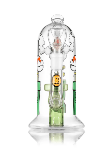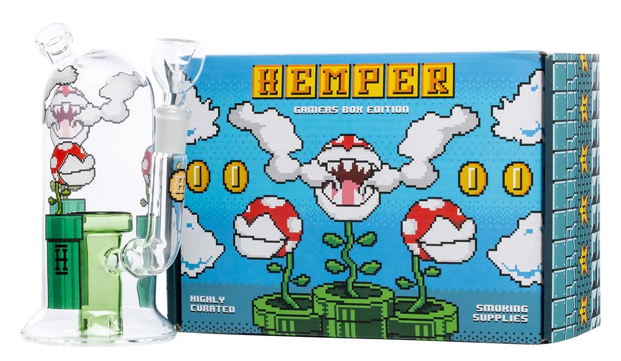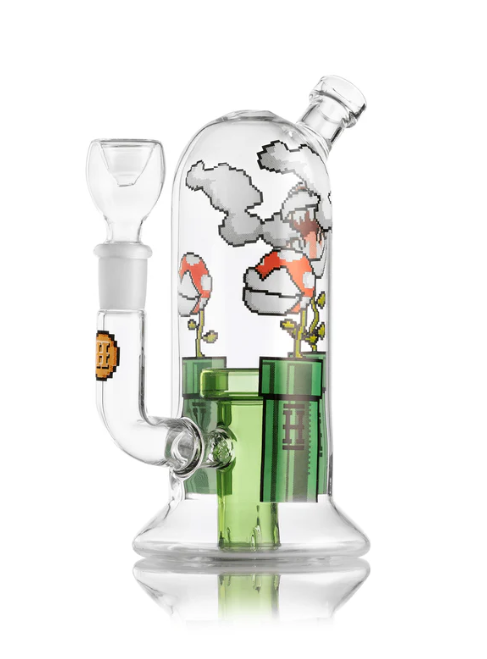 A beautiful glass bong inspired by the game Mario, made by the company HEMPER.